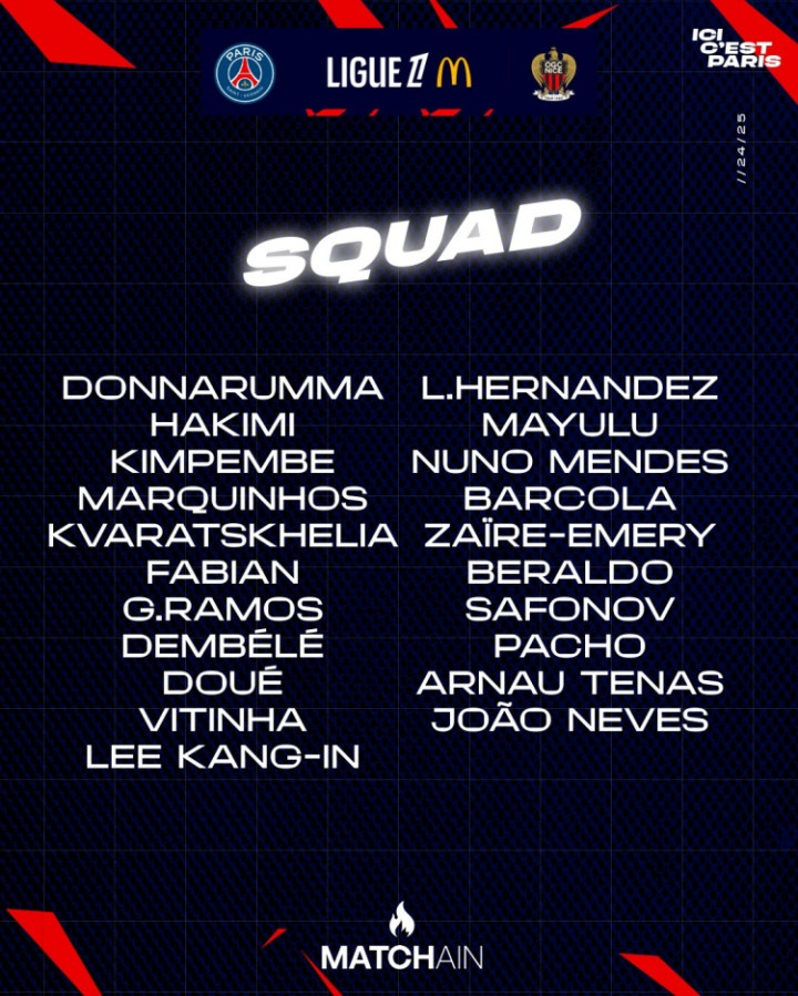 巴黎对阵尼斯大名单: 登贝莱、杜埃、K77在列, 阿什拉夫回归